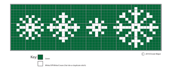 I did a random 'snowflake' search on the web and found this free chart pattern. I decided to use two of these to do a single ribbon around the hat. The main colour is just a plain white, and the snowflakes are a beautiful cobalt blue. I'm finding the yarn a bit on the thin side, even though it's the right gauge so I'm going to line the inside of the hat with a nice fleece.